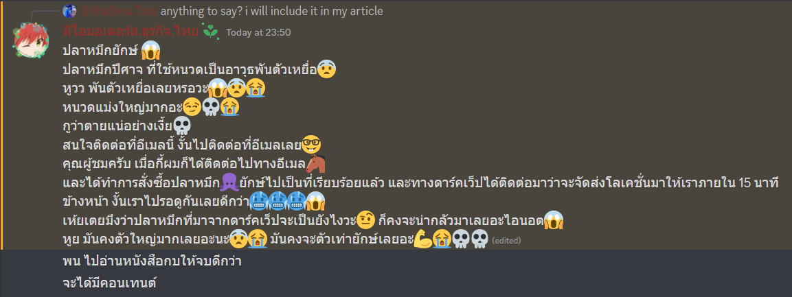 ปีนี้บอกเลยว่าสุดมาก ๆ ไม่เคยคิดเลยว่าคนปัญญาอ่อน ๆ อย่างเราที่ชอบเล่นมุก ปลาหมึกยักษ์😱🐙 จะมาถึงจุดนี้ได้ สำหรับเด็กอายุ 14 ถือว่าเป็นอะไรที่เปิดโลกมาก ๆ ปกติอยู่แต่ในบ้าน (บล็อกนี้เขียนข้ามวันเลยนะเนี่ย...) แต่ก็ขอบคุณทุก ๆ คนที่เป็นส่วนหนึ่งของปีนี้ที่เป็น Inspiration ให้ผมด้วย ขอบคุณพี่หนุ่มที่ให้เสื้อ Hacktoberfest สวย ๆ ผมมาสองตัว ขอบคุณพี่มิ้นที่ทำให้ผมกระตื้อรื้อรนในการเขียนบล็อกสรุปงานเนี่ยแหละ ขอบคุณพี่เรย์กับพี่ลีโอที่ช่วยหาไรคุยเวลาเบื่อ ๆ ขอบคุณพายที่สนับสนุนยูเครน ขอบคุณปัดเตโต้ที่ไปงานด้วยกัน ขอบคุณพี่ออมกับพี่กัสที่คันนี่ 😭 ขอบคุณคนอื่น ๆ ด้วยที่ช่วยเป็นแรงผลักดันให้ผมเรียนรู้อะไรใหม่ ๆ ได้